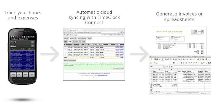 TimeClock torna mais fácil para controlar suas horas trabalhadas e despesas - e então usar esses dados para gerar faturas ou planilhas. É o momento perfeito rastreador Android para freelancers, contratados independentes, advogados ou qualquer pessoa que intitula clientes por hora.