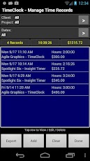 * Exibir e editar todos os registros de tempo dentro do app. Você pode voltar atrás e mudar o início e fim dos tempos, a taxa de faturamento, notas - qualquer campo pode ser editado.